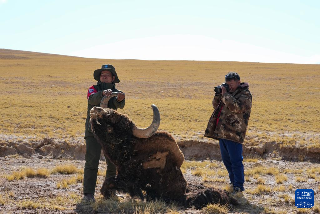 6月13日,羌塘國(guó)家級(jí)自然保護(hù)區(qū)野生動(dòng)物專業(yè)管護(hù)隊(duì)員在檢查一頭野牦牛的尸體。新華社記者 旦增尼瑪曲珠 攝