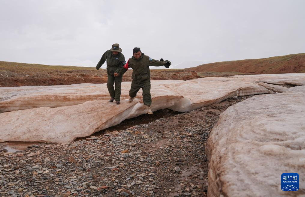 6月15日,羌塘國(guó)家級(jí)自然保護(hù)區(qū)野生動(dòng)物專業(yè)管護(hù)隊(duì)員索朗(右)和羅布檢查河面冰凍情況。新華社記者 費(fèi)茂華 攝