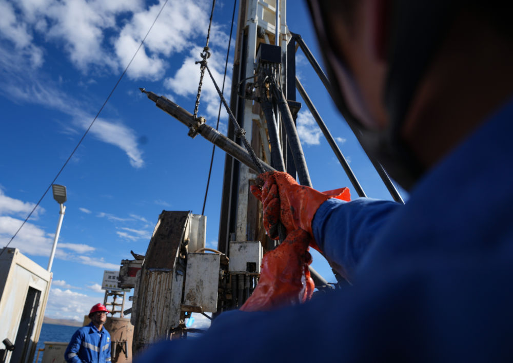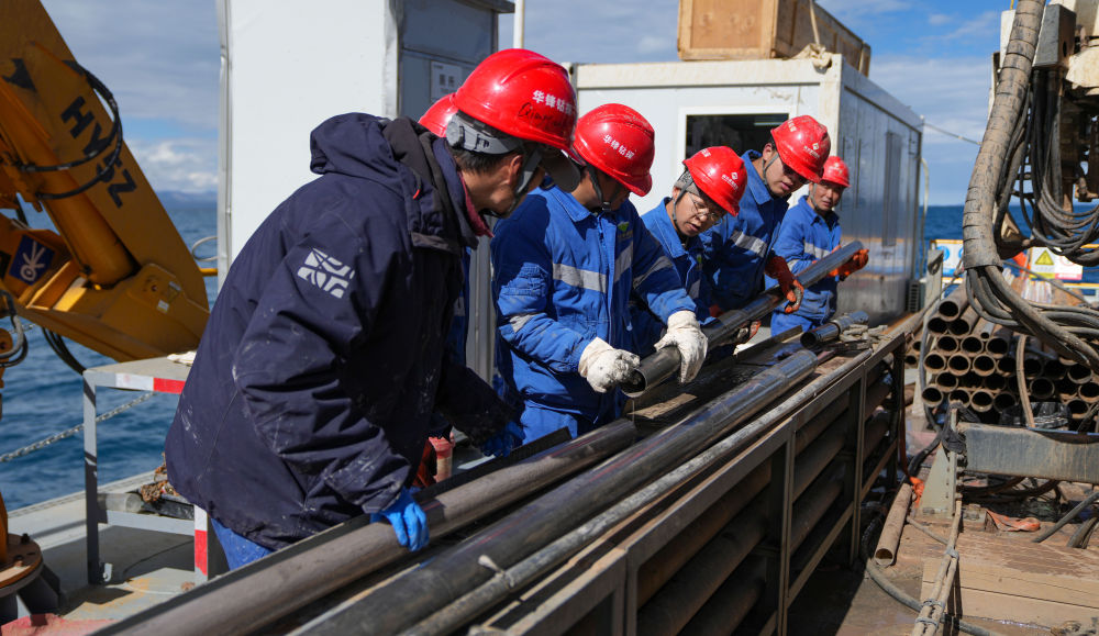 在海拔超過4700米的西藏納木錯中心湖區(qū),21名來自五湖四海的鉆探專業(yè)技術(shù)人員,全天24小時輪班奮戰(zhàn)在面積僅200平方米的水上鉆探平臺上,協(xié)助第二次青藏科考科研人員提取湖泊巖芯樣品,這些樣本如同寶貝一樣,封存著青藏高原納木錯地區(qū)百萬年來的環(huán)境氣候變化信息。 擔任這次湖泊巖芯鉆探任務(wù)的是四川資源集團華鋒鉆探隊。他們從5月31日入駐科考營地、6月6日鉆取第一批湖泊巖芯樣品以來一直奮戰(zhàn)至今。這群平均年齡31歲的鉆探隊員常年工作在高海拔地區(qū),有著豐富的鉆探經(jīng)驗,此次鉆探是他們第一次進行高海拔湖泊鉆探。目前納木錯鉆探深度突破400米,達到國內(nèi)高海拔深水大湖的鉆探新紀錄。這些鉆探隊員在見證奇跡,也在創(chuàng)造歷史。