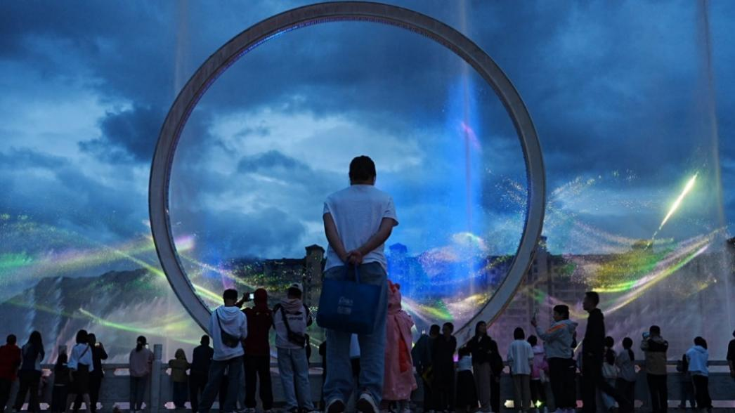 日落西山,微風(fēng)輕撫,林芝市工布公園里熱鬧又悠閑。絡(luò)繹不絕的游客和市民前來觀看夢幻水秀表演,絢麗多彩的燈光秀引得觀眾發(fā)出陣陣驚呼。
