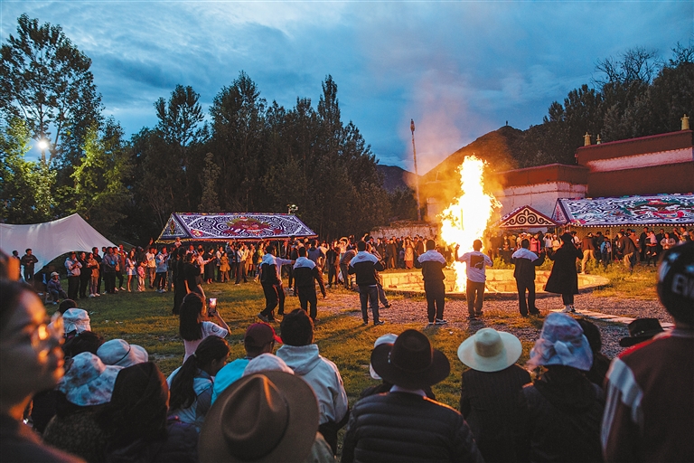 篝火晚會(huì)現(xiàn)場(chǎng),參賽選手跳起了鍋莊(曲水站)。