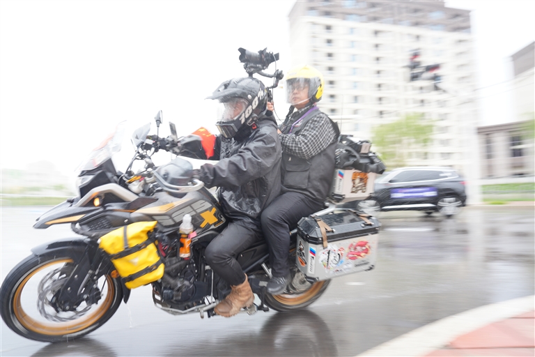 堆龍德慶站比賽中,選手冒雨騎行。