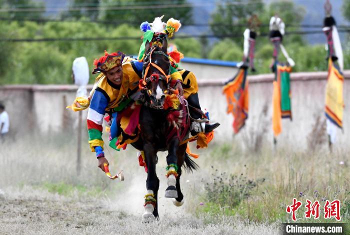 7月27日,西藏拉薩市桑達(dá)村迎來“望果節(jié)”,村民們舉行賽馬活動(dòng)慶祝。“望果節(jié)”是西藏傳統(tǒng)的豐收節(jié),具體日期隨各地莊稼成熟的時(shí)間而變化?!巴?jié)”期間,按照習(xí)俗,各地都會(huì)舉辦賽馬比賽。圖為騎手進(jìn)行馬術(shù)表演。中新社記者 李林 攝