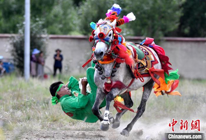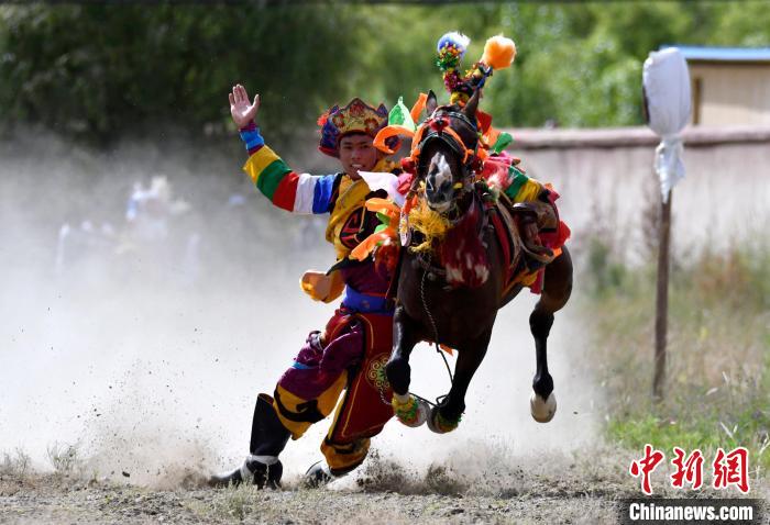 7月27日,西藏拉薩市桑達(dá)村迎來“望果節(jié)”,村民們舉行賽馬活動(dòng)慶祝?!巴?jié)”是西藏傳統(tǒng)的豐收節(jié),具體日期隨各地莊稼成熟的時(shí)間而變化?!巴?jié)”期間,按照習(xí)俗,各地都會(huì)舉辦賽馬比賽。圖為騎手進(jìn)行馬術(shù)表演。中新社記者 李林 攝
