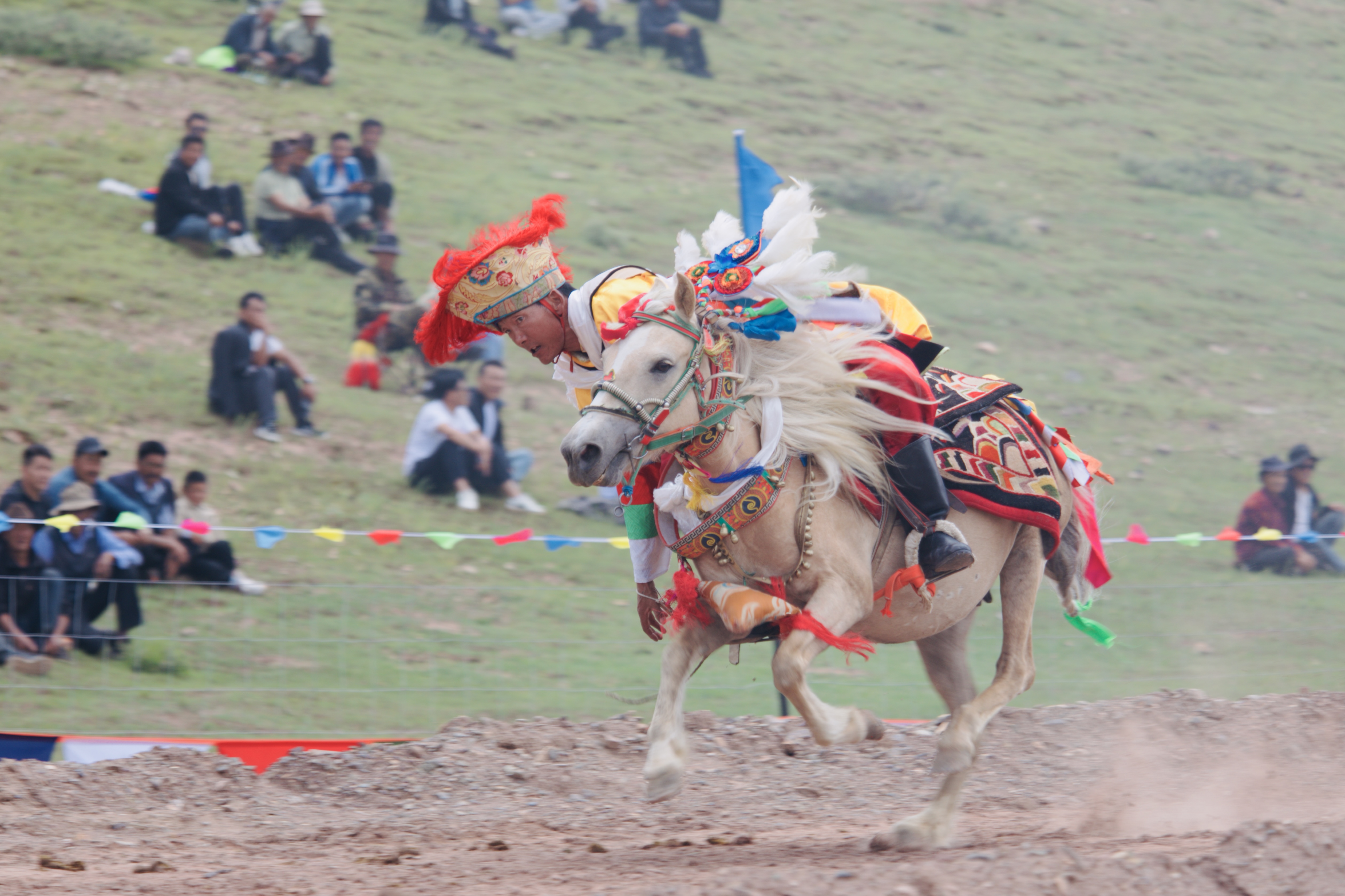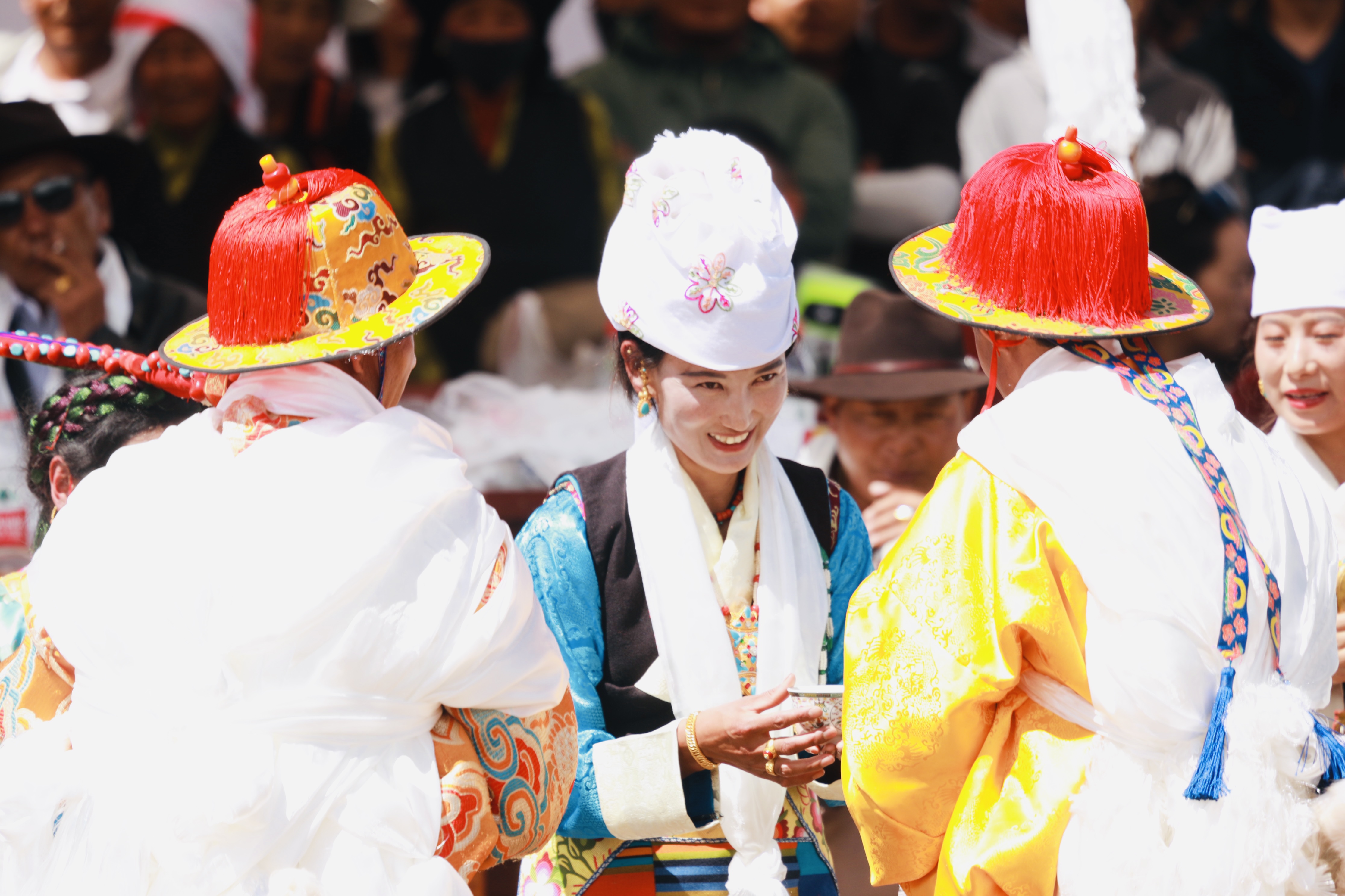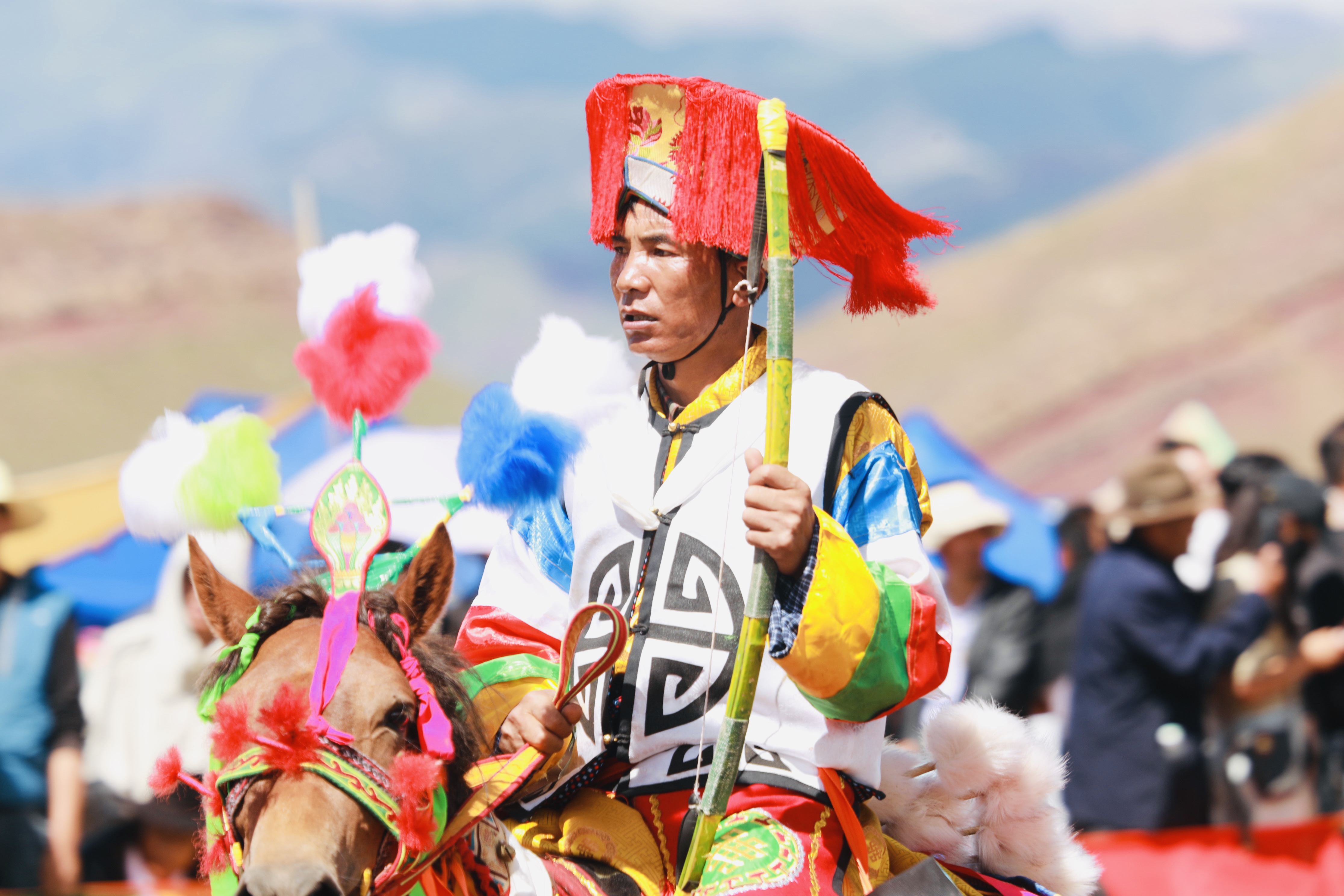 據(jù)悉,賽馬是西藏各地為慶祝豐收舉行“望果節(jié)”(賽馬節(jié))時(shí)的傳統(tǒng)慶典活動,是群眾最為喜愛、流傳最廣的體育運(yùn)動之一。圖為沖許嘛(藏語意為“敬酒者”)為騎手唱歌、敬酒、敬茶。