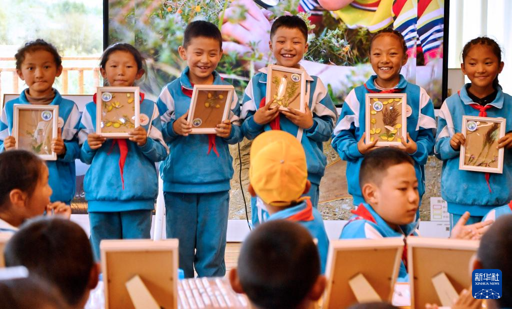 8月15日,拉魯小學(xué)的學(xué)生在拉魯濕地國家級(jí)自然保護(hù)區(qū)管理局科普小教室里向大家展示優(yōu)秀植物標(biāo)本。