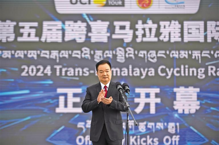 8月21日上午,2024中國西藏第五屆跨喜馬拉雅國際公路自行車極限賽在拉薩市布達拉宮廣場隆重開幕。這是自治區(qū)黨委書記王君正出席開幕式并宣布本屆比賽開幕。 本報記者 李洲 攝