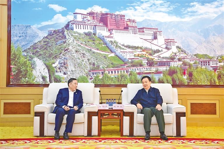 22日上午,自治區(qū)黨委書(shū)記王君正在拉薩與中國(guó)能建集團(tuán)董事長(zhǎng)宋海良率隊(duì)的赴藏考察團(tuán)座談。