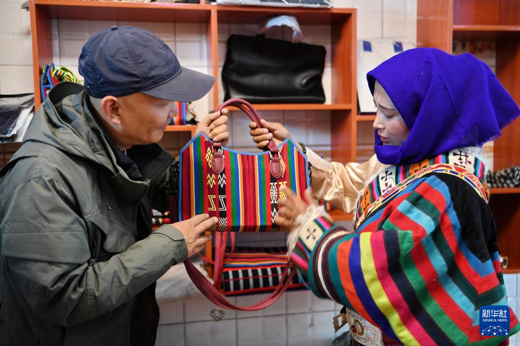 一名來自上海的游客(左)在安多托尕爾倉游牧產(chǎn)業(yè)有限責(zé)任公司展廳挑選產(chǎn)品(8月24日攝)。新華社記者 張汝鋒 攝