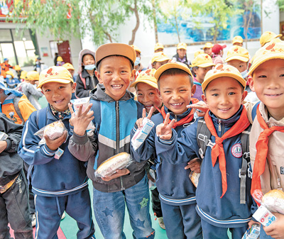 在西藏那曲市班戈縣中石化小學(xué),學(xué)生手拿營(yíng)養(yǎng)餐等待放學(xué)。新華社記者 丁增尼達(dá)攝