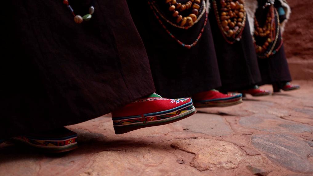 普蘭縣科迦村里有7戶人家保存著7套祖?zhèn)鞣?,一套重達(dá)25公斤,裝飾有黃金、白銀、松石、瑪瑙、珊瑚、珍珠等,承載和沉淀了百年時(shí)光,堪稱“穿在身上的千年史”。