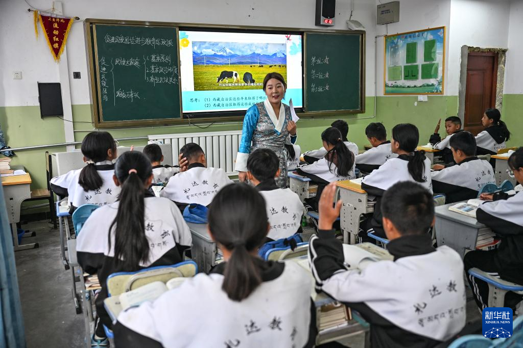 看完一段展示西藏經(jīng)濟(jì)社會發(fā)展日新月異的視頻,孩子們眼睛里亮亮的,爭相舉手發(fā)言:“現(xiàn)在交通越來越便捷,村里的游客多了,我們?nèi)ブ苓吺锌h也更方便?!薄案髅褡逋麍F(tuán)結(jié)一心!西藏的明天會更好!”……
