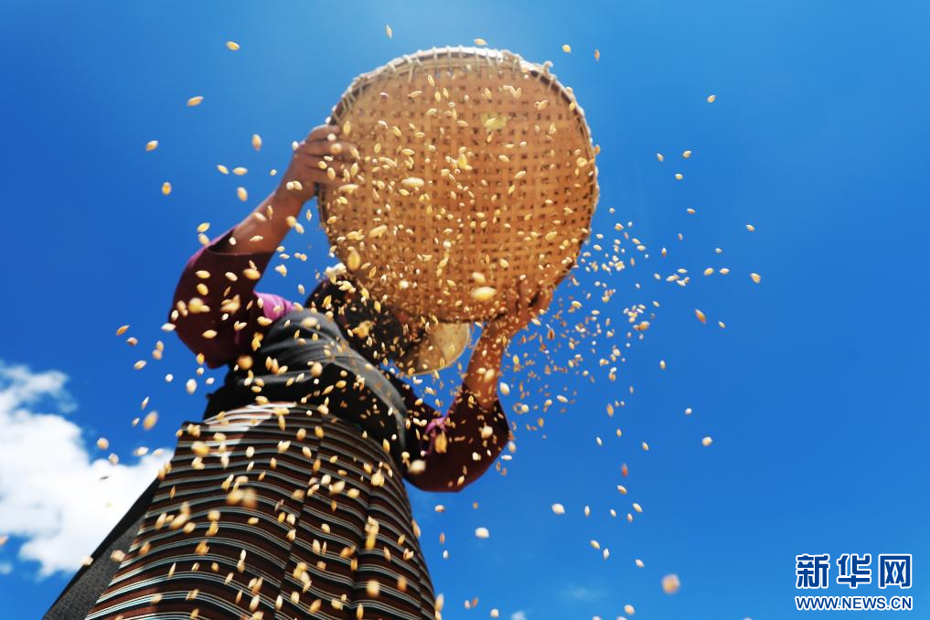 9月19日,村民手持篩子來回晃動(dòng),黃色的青稞不斷從篩子中掉落下來。新華網(wǎng)發(fā) 洛克攝