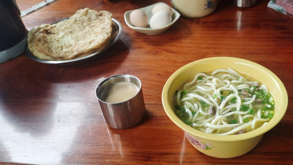 藏面的經典套餐中還包括牛肉油餅、雞蛋和甜茶。新華社記者魏冠宇 攝