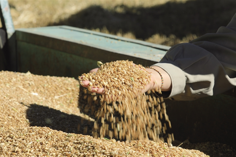 “我家共有92畝多的農(nóng)田,家里有三個勞力,我負責秋收,其余兩個外出務(wù)工,以前我們家秋收工作需要一個月多的時間,現(xiàn)在農(nóng)業(yè)機械化了,再也不用擔心秋收工作,聽說今年賣良種每斤有0.3元的補貼,準備把自家10000斤良種賣掉,預(yù)計今年有56000多元的收入?!闭诎徇\青稞粒的村民普瓊高興地說道。