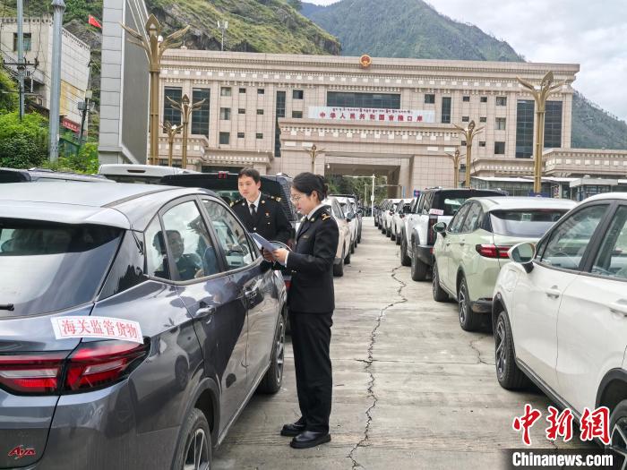 圖為在吉隆口岸,海關工作人員驗放車輛。資料圖 拉薩海關 供圖