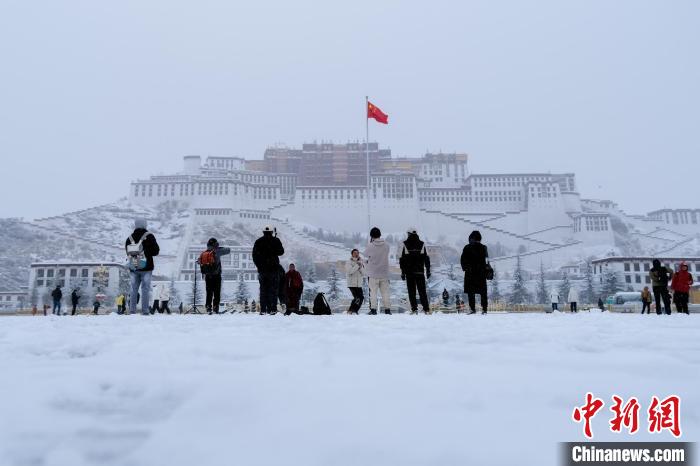 資料圖為2024年1月18日,拉薩迎來(lái)降雪天氣,游客在拉薩布達(dá)拉宮廣場(chǎng)合影留念。江飛波 攝