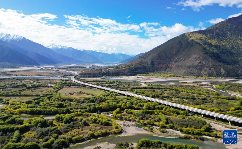 西藏林芝雅尼國家濕地公園內(nèi)的觀景臺和步行棧道(10月24日攝,無人機照片)。新華社記者 李賀 攝