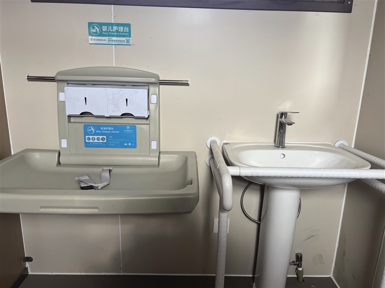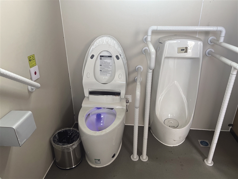 公廁內部除了正常的蹲位,還設有第三衛(wèi)生間。第三衛(wèi)生間內配有嬰兒護理臺、嬰兒安全座椅等設施。除此之外,第三衛(wèi)生間還設有安全扶手、智能馬桶等設備,方便腿腳不方便的老年人及殘疾人。智能馬桶旁還安裝有緊急報警器?!叭绻欣先嗽趲梗涂梢园匆幌戮o急報警器。這也是我們考慮到殘疾人、老年人如廁不方便,增設的人性化設計。”赤列說。