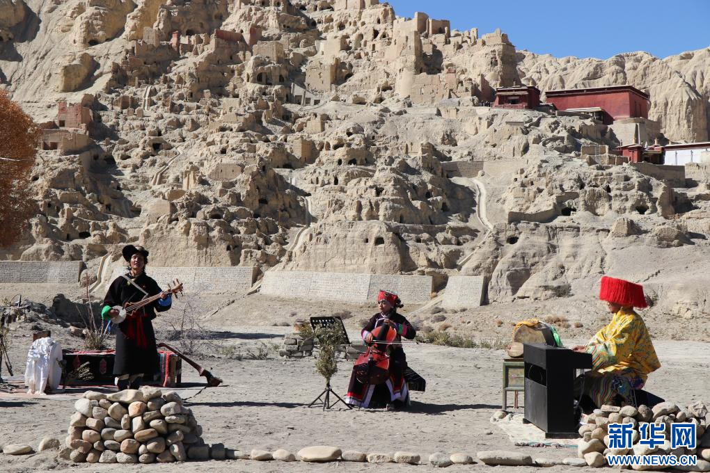 這是11月9日在古格遺址前的演奏現(xiàn)場,多名樂手正在合奏西藏傳統(tǒng)音樂。新華社 發(fā)