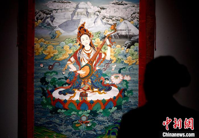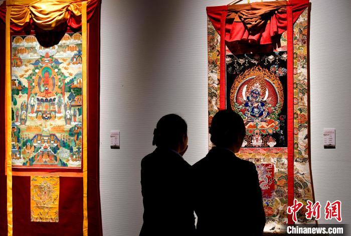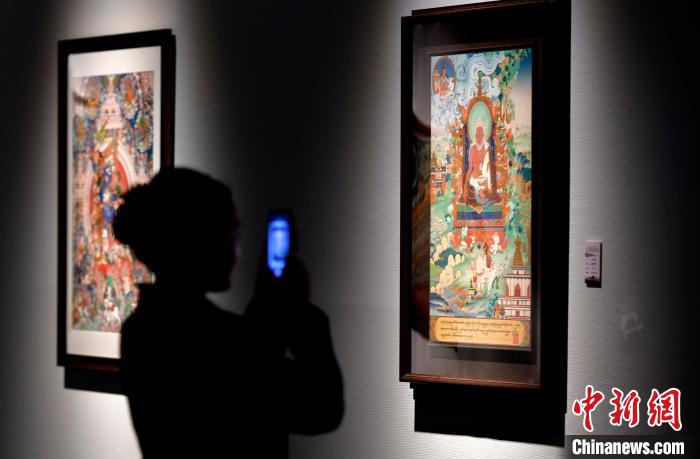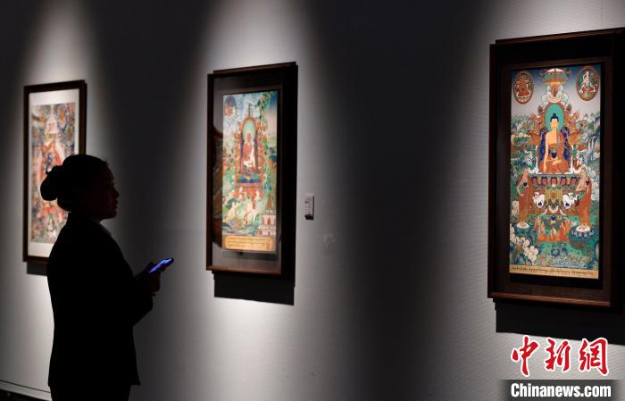 圖為觀眾欣賞展覽中的唐卡作品。中新社記者 李林 攝