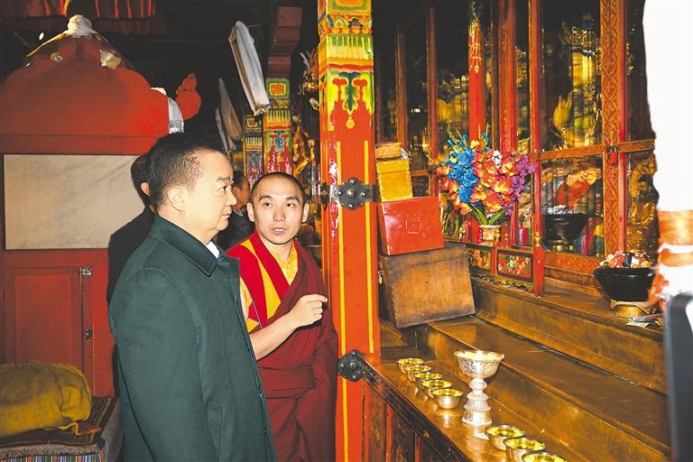 王君正深入寺廟開展調(diào)研,與僧尼親切交流。扎西吉培寺坐落于謝通門縣,歷史悠久、氣勢恢宏。王君正來到這里,詳細了解該寺加強和創(chuàng)新寺廟管理、寺廟歷史、文物保護等情況,聽取“三個意識”教育工作開展情況匯報。指出,要進一步深化拓展“三個意識”教育,總結(jié)提升好經(jīng)驗好做法,對該寺結(jié)合實際建立“六項機制”,完善僧尼綜合考核,推動僧尼實現(xiàn)自我教育、自我管理、自我約束等工作進行總結(jié)提煉、不斷完善;依法加強宗教事務(wù)管理,掌握宗教工作科學(xué)方法,推動宗教事務(wù)管理法治化、規(guī)范化、常態(tài)化,強化寺管會工作職能,加強寺管會干部隊伍建設(shè),推動宗教工作由“管得住”向“管得好”轉(zhuǎn)變。王君正在考察了解到該寺珍藏著《甘珠爾》《丹珠爾》等文物古籍時指出,要加強文物古籍保護利用,切實提高文物保護的科技含量和裝備水平,讓珍貴古籍、文物資源煥發(fā)新生、世代傳承,留住歷史的痕跡和文明的根脈。王君正對該寺組織僧尼前往區(qū)外學(xué)習參觀感到高興,指出,加強西藏宗教界與區(qū)外交流學(xué)習是鑄牢中華民族共同體意識的具體體現(xiàn),對于深入推動各民族交往交流交融將起到積極促進作用,必將進一步構(gòu)筑中華民族共有精神文化家園。