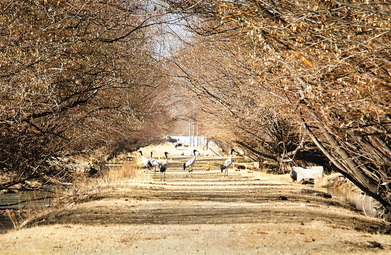 位于雅魯藏布江與年楚河交匯處的日喀則市桑珠孜區(qū)邊雄鄉(xiāng),是黑頸鶴的越冬地之一。這里有廣袤的農田和濕地,黑頸鶴可在此覓食、過冬。