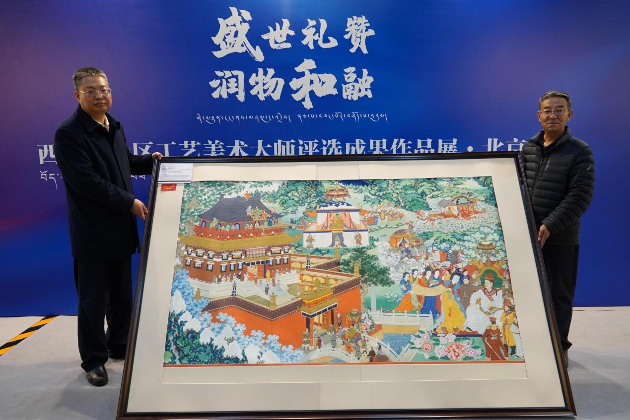 “西藏自治區(qū)工藝美術(shù)大師評選成果作品展”由西藏自治區(qū)經(jīng)濟和信息化廳、西藏自治區(qū)民族事務(wù)委員會聯(lián)合主辦,于2024年11月7日在民族文化宮展出。本次捐贈作品為“西藏自治區(qū)工藝美術(shù)大師評選成果作品展”中的5件代表性精品力作,包括唐卡作品《格薩爾王》(復(fù)制件)(作者:貢覺杰)、《文成公主建小昭寺》(復(fù)制件)(作者:羅布斯達)、《一枝一葉總關(guān)情》(復(fù)制件)(作者:珠木巧),堆繡作品《金絲野牦牛》(作者:晉美洛追)、《石榴籽》(作者:晉美洛追)。任毅同志向作者頒發(fā)了收藏證書,并表示誠摯感謝。