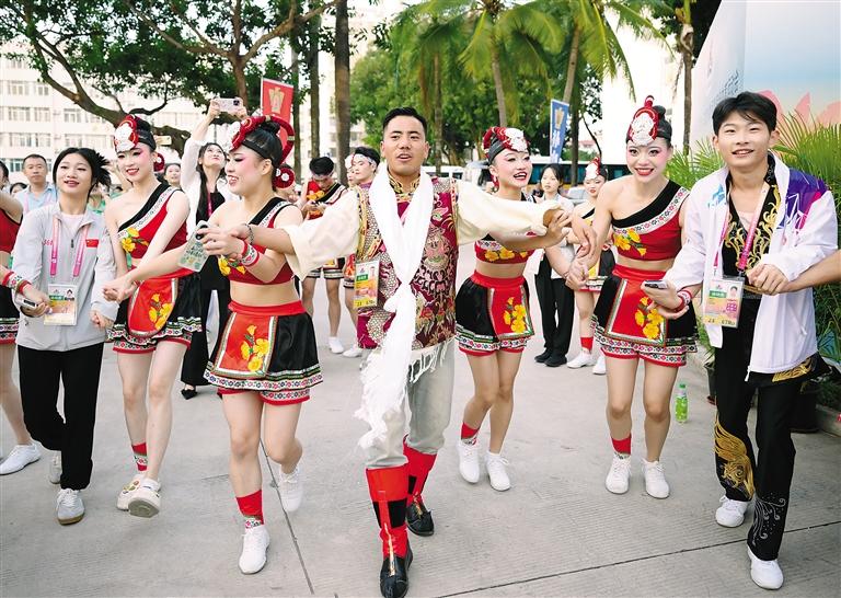 11月26日,運動會特別安排了“民族大聯(lián)歡”活動。獨具海南特色的牛角號與蛙鑼齊齊奏響,喜迎八方賓客,表演者、運動員、教練員一起手拉手載歌載舞。西藏運動員身著盛裝,和來自北京西藏中學(xué)的運動員一起唱藏歌、跳鍋莊、送禮物,和香港特別行政區(qū)運動員互送吉祥物、紀念品,相互交流、拍照留念。