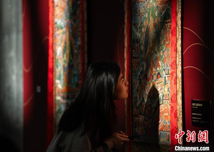 圖為來賓參觀精美的唐卡摹品。中新網(wǎng)記者 侯宇 攝
