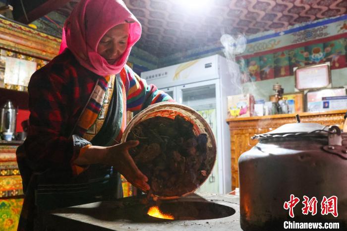 12月12日,西藏自治區(qū)那曲市安多縣帕那鎮(zhèn)牧民土巴卓瑪用牛糞燒火。中新社記者 薛蒂 攝