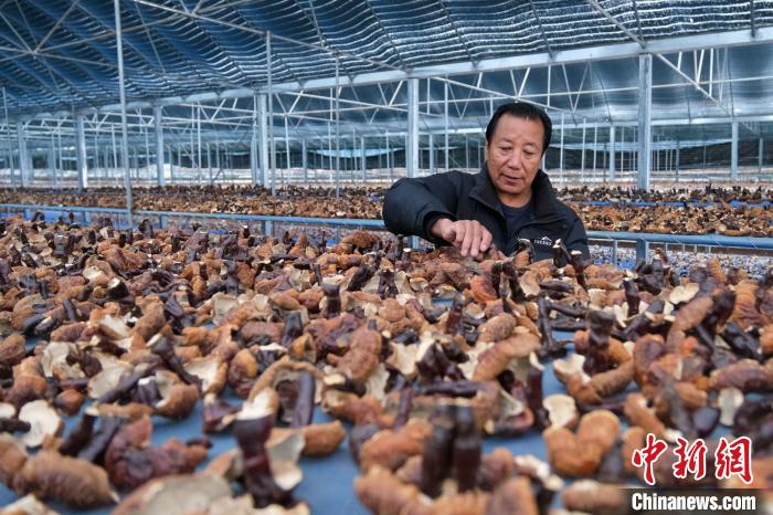 圖為12月10日,尼瑪在農(nóng)場(chǎng)大棚內(nèi)檢查靈芝風(fēng)干情況。記者 江飛波 攝