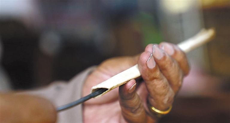 圖為技藝師正在用鐵絲清理骨頭里面殘留的碎渣。