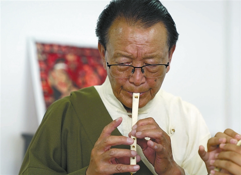 圖為國家一級演奏員次旦正在吹奏鷹笛。