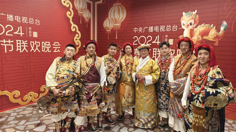 圖為國家一級演奏員次旦(右四)在中央廣播電視總臺2024春晚后臺與其他表演者合影。