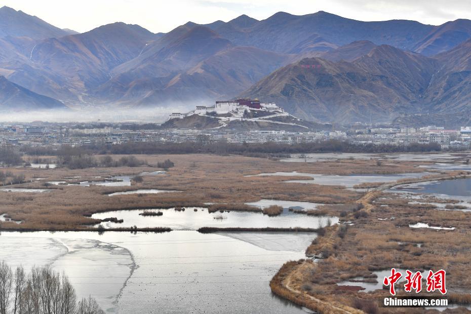 12月29日,冬日早晨,拉薩美如畫。拉薩河被晨光染成金色,河水靜靜流淌。西藏自治區(qū)拉薩市的拉魯濕地國家級自然保護區(qū)內,候鳥歡快,忙著覓食、嬉戲。遠處,布達拉宮與拉魯濕地相互映襯,構成了一幅絕美畫卷。圖為12月29日,晨霧中的布達拉宮。貢確 攝