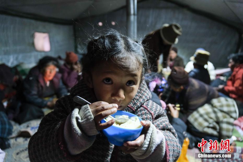 1月7日9時5分,西藏自治區(qū)日喀則市定日縣措果鄉(xiāng)附近(東經(jīng)87.45度,北緯28.50度)發(fā)生6.8級地震。日喀則市官方介紹,經(jīng)初步排查,截至當日15時,地震共造成95人遇難,130人受傷,房屋損毀正在統(tǒng)計中。圖為日喀則拉孜縣境內(nèi)的村民在臨時搭建的帳篷里吃飯。中新社記者 江飛波 攝