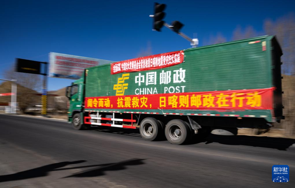 1月8日,在日喀則市境內(nèi)的318國道,中國郵政的抗震救災運輸車輛向災區(qū)方向駛去。新華社記者 丁增尼達 攝