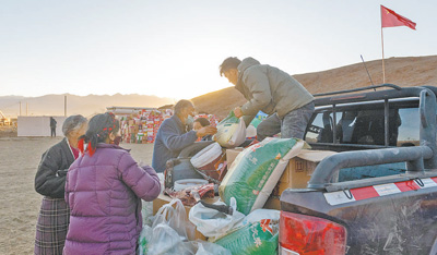 1月8日,在定日縣長所鄉(xiāng)古榮村安置點,志愿者為受災(zāi)群眾發(fā)放物資。人民網(wǎng)記者 翁奇羽攝