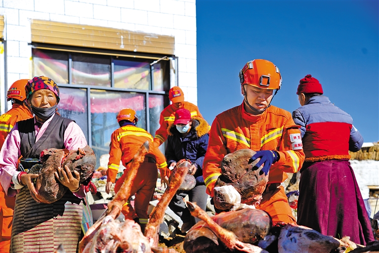 1月8日,在定日縣措果鄉(xiāng)美朵村,林芝市森林消防支隊(duì)消防員在協(xié)助受災(zāi)群眾轉(zhuǎn)移冬季存放的羊肉。記者 索朗群培 攝