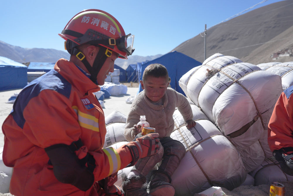 2025年1月8日,在定日縣措果鄉(xiāng)塘仁村安置點(diǎn),消防救援人員和小朋友互動(dòng)。新華社記者 晉美多吉 攝