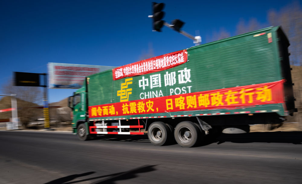 2025年1月8日,在日喀則,中國(guó)郵政的抗震救災(zāi)物資運(yùn)輸車輛向震中方向駛?cè)ァP氯A社記者 丁增尼達(dá) 攝