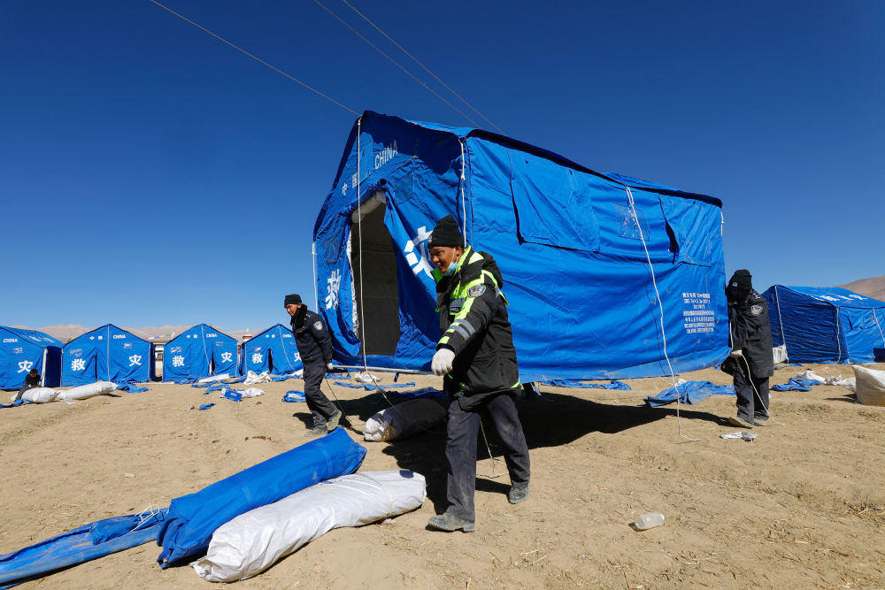 2025年1月8日,在日喀則市定日縣措果鄉(xiāng)雪珠村安置點(diǎn),救援人員幫助受災(zāi)群眾搭建帳篷。新華社記者 沈伯韓 攝