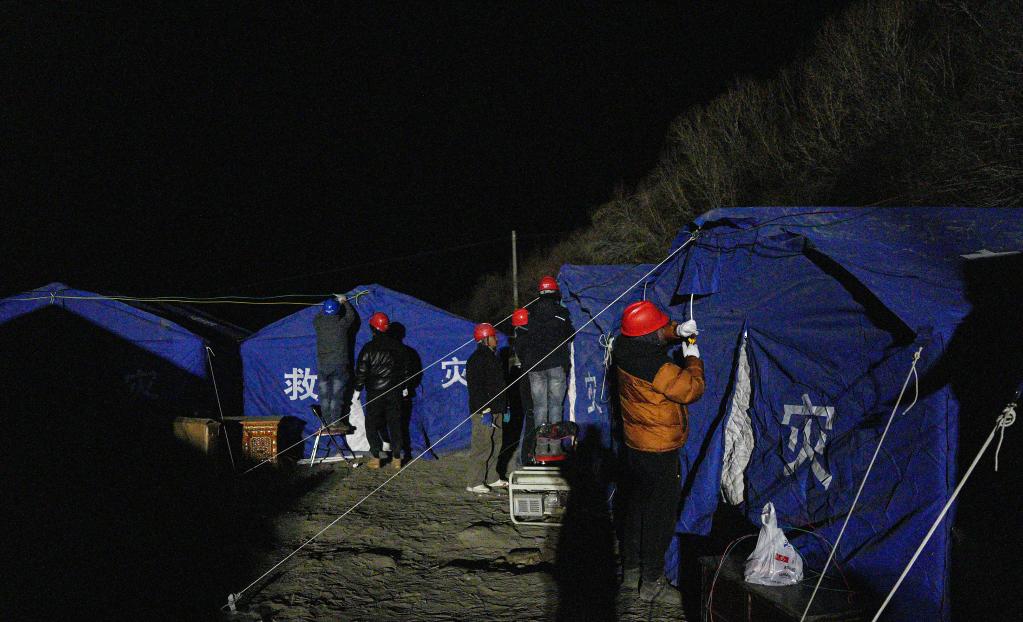 1月7日,在定日縣長所鄉(xiāng)集中安置點(diǎn),工作人員在保障電力供應(yīng)。