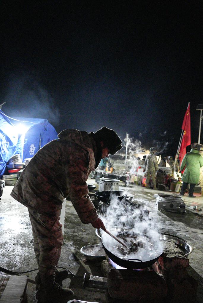 1月7日,在定日縣古榮村集中安置點(diǎn),解放軍為受災(zāi)群眾做飯。