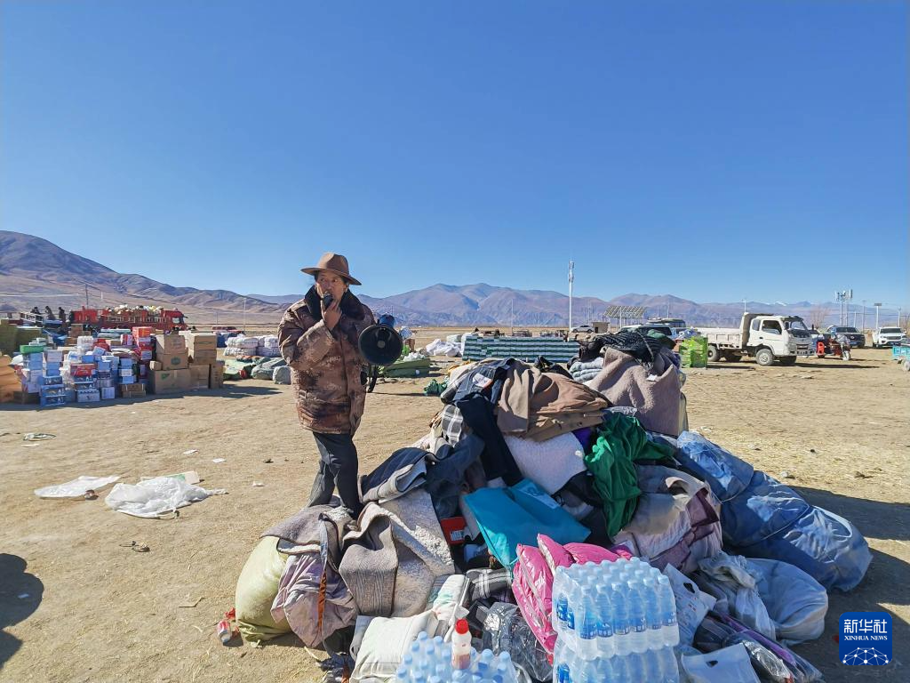 9日上午11時(shí)許,在西藏日喀則市拉孜縣拉孜鎮(zhèn)措布村村委會(huì)門口,52歲的村黨支部書記達(dá)娃正在調(diào)度抗震物資。