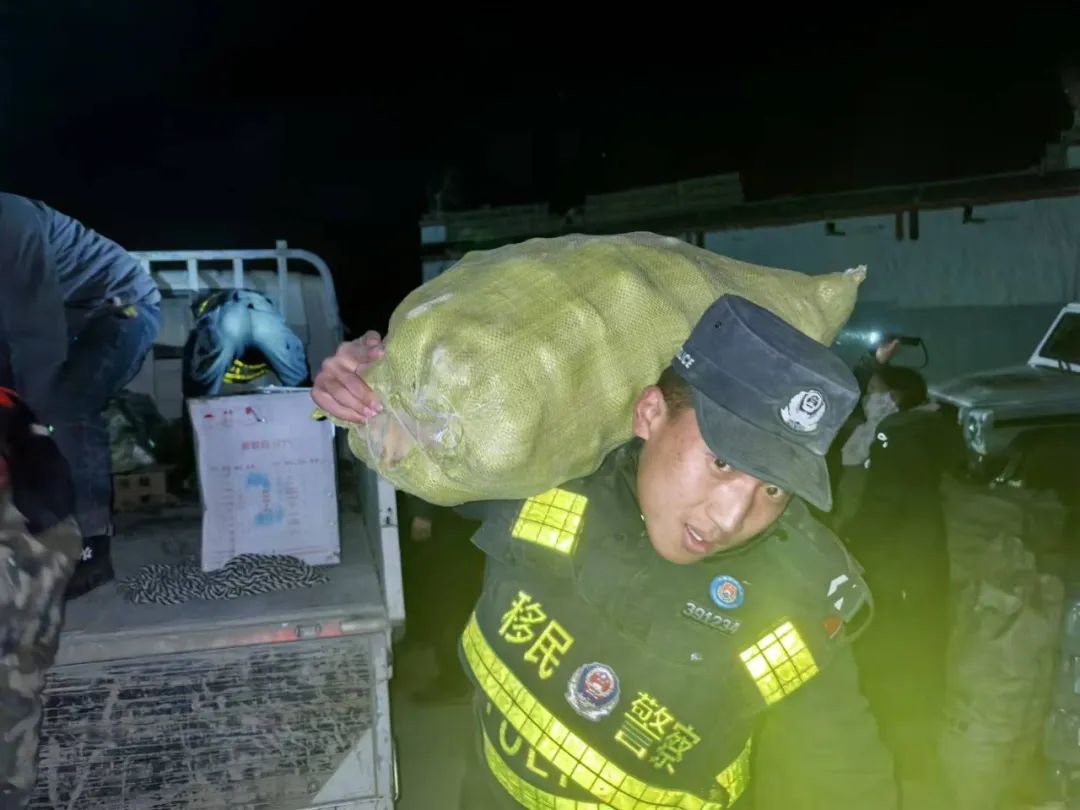 圖為在日喀則市定日縣長所鄉(xiāng)雜村安置點(diǎn),日喀則邊境管理支隊雜村“帳篷警務(wù)室”民警搬運(yùn)物資。蘇恒 攝