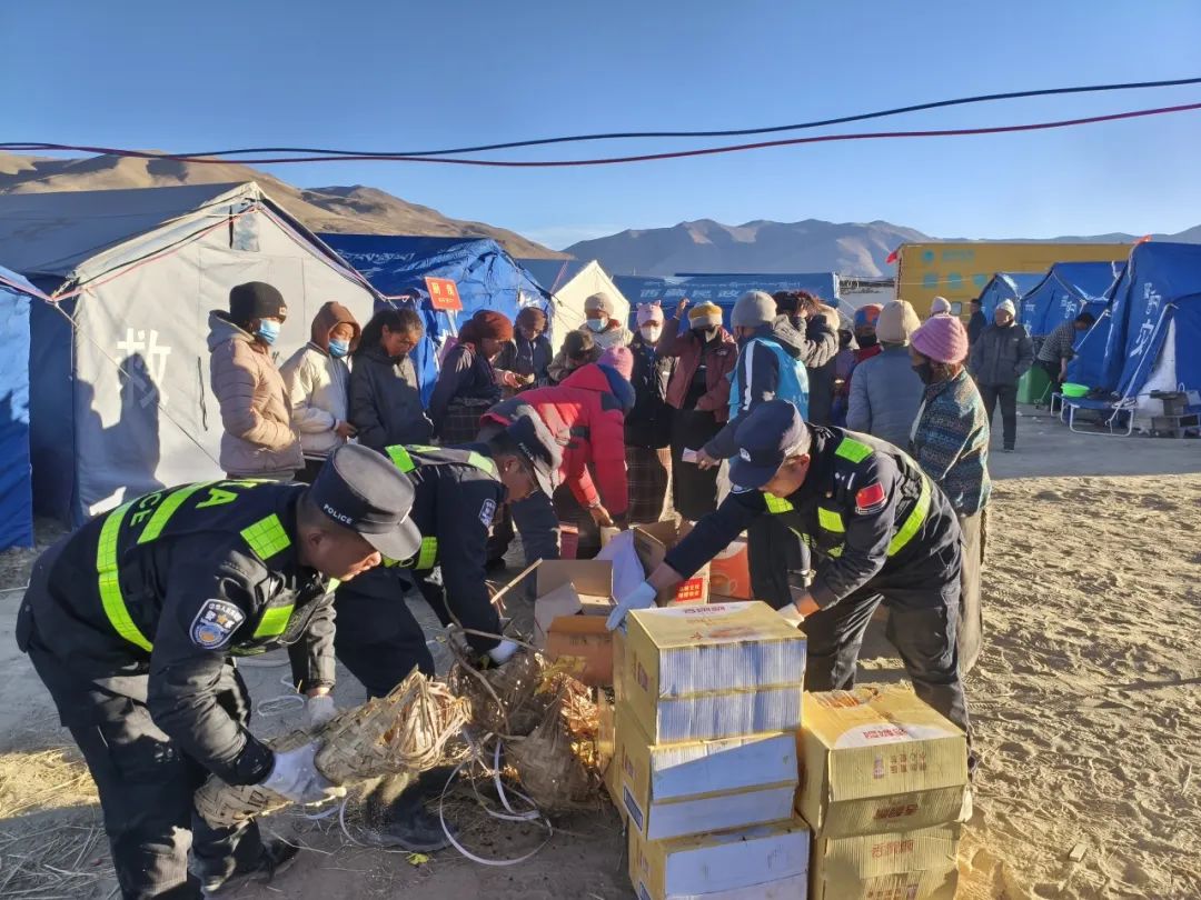 圖為在日喀則市定日縣長所鄉(xiāng)嘎布村安置點(diǎn),日喀則邊境管理支隊嘎布村“帳篷警務(wù)室”民警幫助群眾卸載救災(zāi)物資。貢嘎齊平 攝