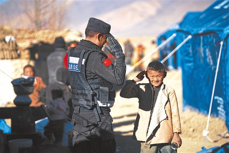 “照片上的這位民警是我們的同事,叫普次仁。1月9日,他在村里的臨時(shí)安置點(diǎn)巡邏的時(shí)候,看到一個(gè)小男孩,便將自己手中的飲料遞給他。沒想到這個(gè)叫達(dá)瓦扎西的小男孩很認(rèn)真地給他敬了個(gè)禮?!倍ńY(jié)縣公安局應(yīng)急救援小分隊(duì)隊(duì)員高靜說,“照片是我在定日縣措果鄉(xiāng)吉翁村拍的?!?/p>