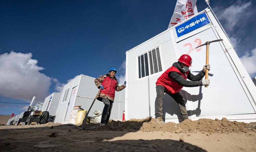 在定日縣長所鄉(xiāng)嘎旦村,國家電網(wǎng)工作人員在挖槽預(yù)埋電線(1月13日攝)。新華社記者 丁增尼達(dá) 攝